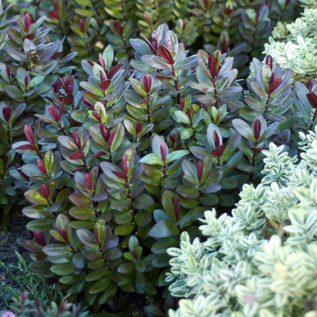 Les à grandes feuilles se distinguent par des épis de fleurs spectaculaires naissant au-dessus du feuillage, dans l’axe des feuilles, comme chez Hebe ‘‘ ou ‘‘. Les Hebe à petites feuilles ont des formes compactes, une floraison plutôt discrète et une coloration intéressante du feuillage à utiliser sans modération pour structurer un massif ou un jardin moderne aux formes épurées. Certaines variétés nous gratifient d’une jolie floraison en plus d’un feuillage exceptionnel comme l’Hebe ‘’ dont le feuillage lumineux vert pourpre panaché de crème en été vire progressivement au pourpre marginé de rose avec le froid.